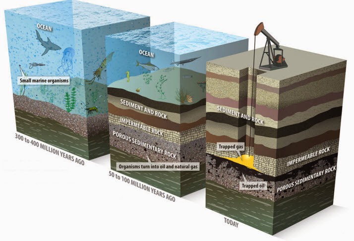 เมื่อชั้นตะกอนต่างๆ ถูกทับถมมากขึ้นจนหนานับเป็นร้อยๆ พันๆ เมตร เกิดน้ำหนักกดทับกลายเป็นชั้นหินต่างๆ เช่น ชั้นหินทราย, ชั้นหินปูนและชั้นหินดินดาน ความกดดันจากชั้นหินเหล่านี้กับความร้อนใต้ผิวพื้นโลก และการสลายตัวของอินทรียสารโดยแบคทีเรียที่ไม่ต้องการอากาศ (Anaerobic Bacteria) ทำให้ซากพืชและสัตว์สลายตัวกลายสภาพเป็นหยดน้ำมันและก๊าซธรรมชาติหรือปิโตรเลียม โดยมีธาตุไฮโดรเจนและธาตุคาร์บอนซึ่งได้จากการสลายตัวของอินทรียสารเป็นองค์ประกอบที่สำคัญ ปิโตรเลียมที่เกิดขึ้นนี้ เมื่อถูกบีบอัดจากน้ำหนักของชั้นหินที่กดทับก็จะเคลื่อนที่เข้าไปตามช่องว่างระหว่างเม็ดทรายหรือชั้นหินที่มีรูพรุน โดยมีชั้นหินเนื้อแน่นปิดทับอยู่